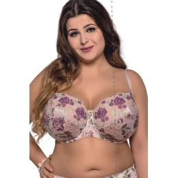Krásna mäkká podprsenka v jesenných farbách - svetlé ružové spojené s Vresovú fialovou a zelenou.Košíčky tohto modelu krásne obopínajú poprsie a udržujú ho na správnom mieste. Zároveň vytvára krásny dekolt, ktorý zvýrazňujú.Spodná časť košíčkov je vyrobená z pevnejšej látky potlačenej kvetinovým motívom. Horná časť košíčkov pokrýva výšivka, ktorá je podšitá jemnou sieťovinou. Mostík tvorí rovnaká látka, ktorá bola použitá na spodnú časť košíčkov. Boky sú ušité z pružnej lycrové látky, ktorá je taktiež potlačená kvetinovým vzorom a ktorá sa pri nosení nevyťahuje.V strede podprsenky, medzi košíčkami, je umiestnená mašlička s ozdobným príveskom.Ramienka tohto modelu je možné nastaviť, ale nemožno ich odopnúť. Ich šírka závisí na rozmere a veľkosti podprsenky. V miestach, kde sa ramienka spájajú s košíčkami, sú umiestnené malé mašličky a ramienka zdobia aplikácie z plastickej čipky v tvare bubliniek.Model je doplnený o zvislé bočné kostice a zapína sa na dvoch alebo třířadové háčiky (v závislosti od rozmeru) s trojstupňovou možnosťou nastavenia obvodu.Zloženie: 90% polyamid, 7% elastan, 3% polyester.