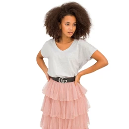 Modelka má na sebe veľkosť S. Miery modelky: výška 172 cm, hrudník 87 cm, pás 60 cm, boky 91 cm.