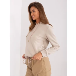 Béžová mikina s kapucňou a šnúrkou na stiahnutie.