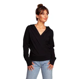 Mikina s trochu iným poňatím elegancie, obálkovým strihom so zaväzovaním a kapucňou, doplnená úzkymi rukávmi s výrezmi na palec v manžetách.