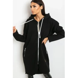 Dámska mikina s kapucňou s predĺženým strihom, dlhými rukávmi a kapucňou. Mikina sa zapína na zips a na bokoch má vrecká na zips.