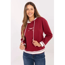Dámska mikina s ležérnym charakterom, vyrobená z prevažujúcej zmesi bavlny a elastanu, ktorá zaručuje pohodlie a voľnosť pohybu. Model štandardnej dĺžky má dlhé rukávy s kontrastnými manžetami, ktoré sa v spodnej časti opakujú, čo dodáva mikine moderný vzhľad. Vybavená je praktickou kapucňou so šnúrkami, ktorá je ideálna na každodenné príležitosti. Hladký povrch materiálu je obohatený o vyšívanú prednú časť, ktorá celku dodáva štýlový akcent. Mikina nemá zapínanie, čo zdôrazňuje jej voľný a pohodlný charakter.