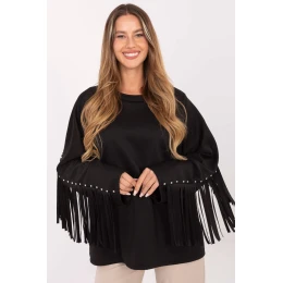 Dámsky sveter s ležérnym charakterom, navrhnutý s ohľadom na každodenný štýl. Materiál s maslovou jemnosťou, vyrobený z kombinácie viskózy a polyesteru, je mäkký a neuveriteľne príjemný na dotyk. Hladká štruktúra dodáva všestrannosť, zatiaľ čo štandardná dĺžka a klasický okrúhly výstrih zaručujú, že sa dokonale prispôsobí postave. Dlhé rukávy sú zdobené frangés a nitmi, ktoré celku dodávajú osobitý charakter. Frangés sa objavuje aj na zadnej strane, čím sa zdôrazňuje originálny, moderný štýl svetra. Je ideálnou voľbou pre ženy, ktoré oceňujú pohodlie spojené s módnym detailom.
