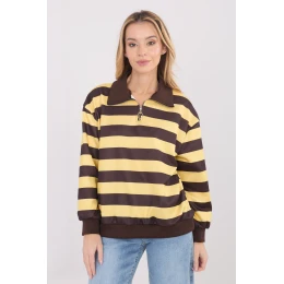 Dámská pruhovaná mikina je pohodlný a stylový návrh v casualovém provedení, ideální na každý den. Vyrobená z měkkého a příjemného materiálu spojujícího viskózu s elastanem, poskytuje pohodlí a volnost pohybu po celý den. Klasický pruhový vzor dodává mikině nadčasový charakter a usnadňuje ji kombinovat s mnoha outfitmi. Model s standardní délkou a dlouhými rukávy se skvěle hodí na chladnější dny. Krátký zipový límec je praktickým a stylovým detail, který umožňuje upravovat výstřih podle vlastních preferencí. Mikina nemá žádné další zapínání, díky čemuž je pohodlná a snadno se obléká. Jedná se o univerzální kousek oblečení, který skvěle ladí s džínami, látkovými kalhotami nebo legíny, vytvářející pohodlné a módní sestavy na každý den.