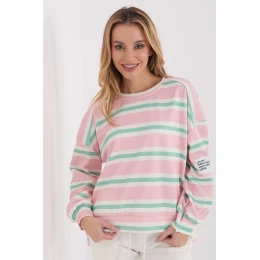 Elegantná dámska mikina s ležérnym charakterom, ideálna na každodenné nosenie. Má módny pruhovaný vzor, ktorý jej dodáva moderný a univerzálny vzhľad. Je vyrobená z príjemnej viskózy s prídavkom elastanu, vďaka čomu je mäkká, pružná a pohodlná na celodenné nosenie. Model so štandardnou dĺžkou, dlhými rukávmi a okrúhlym výstrihom, ktorý klasicky padne na postavu. Mikina nemá zapínanie, čo zdôrazňuje jej ležérny štýl a pohodlie pri nosení. Ďalšou výhodou je ozdobná nášivka na rukáve, ktorá celku dodáva originálny charakter. Výborne sa hodí ku každodenným outfitom, a to tak k džínsom, ako aj k látkovým nohaviciam alebo legínam.