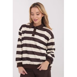 Casuální dámská mikina s nadčasovým a univerzálním stylem, ideální pro každodenní outfit. Model vyniká módním pruhovaným vzorem, který dodává celku svěžest a lehce sportovní charakter. Mikina je vyrobena z vysoce kvalitní viskózy s přídavkem elastanu, co zajišťuje měkkost, pružnost a vysoký komfort nošení. Střih s standardní délkou a dlouhým rukávem se dobře přizpůsobuje postavě a osvědčí se po celou sezónu. Zapínání na knoflíky na přední straně typu polo ve spojení s klasickým límcem dodává mikině elegantní, ale zároveň uvolněný vzhled. Jedná se o skvělý návrh pro ženy, které ocení pohodlí spojené s propracovanými detaily. Mikina skvěle ladí s džínsy, látkovými kalhotami nebo sukni, vytvářející stylové kombinace na každý den.