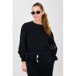 Dámský svetr s krátkým střihem je stylový a pohodlný návrh v casualovém provedení. Skvěle se hodí do každodenních outfitů jak k džínům, legínám, tak i teplákovým kalhotám. Hladký vzor jí dodává univerzální charakter, díky čemuž ji snadno sladíte s různými kousky šatníku. Model je vyroben z vysoce kvalitní směsi bavlny a polyesteru. Tento složení zajišťuje pohodlí nošení, jemnost na dotek, stejně jako odolnost a odolnost proti vráskám. Svetr má klasický, kulatý výstřih a dlouhé rukávy s moderním objemným střihem, který dodává celku ženský a moderní charakter. Chybějící zapínání zdůrazňuje minimalistický styl, a ozdobný nápis umístěný na levém rukávu představuje jemný designový akcent. Je to ideální návrh pro ženy, které ocení pohodlí spojené s módními detaily.