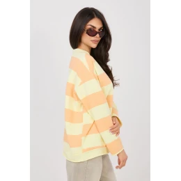 Stylový dámský svetr s ležérním charakterem je skvělým návrhem na každý den. Osvedčí se jak v městských stylizacích, tak během relaxace nebo setkání s přáteli. Výrazný vzor v pestrobarevných pruzích jí dodává módní, svěží vzhled a přitahuje pozornost. Model standardní délky zajistí pohodlí a volnost nošení, dlouhé rukávy zase dělají z tohoto svetru ideální kousek na chladnější dny. Výstřih do V decentně zdůrazňuje krk a dodává celkovému vzhledu ženský charakter. Svetr nemá zapínání, díky čemuž je snadný na obléknutí a skvěle padne na postavě. Vyrobený z kvalitní směsi bavlny a polyesteru spojuje měkkost, prodyšnost a odolnost materiálu. Jedná se o univerzální kousek šatníku, který skvěle doplní jak džíny, tak látkové kalhoty nebo sukně, vytvářejíc pohodlné a stylové sestavy na každou příležitost.