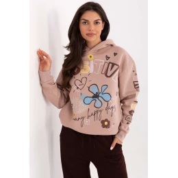 Dámska mikina v ležérnom štýle, ideálna na každodenné príležitosti. Je vyrobená zo zmesi bavlny a polyesteru a poskytuje pohodlie a príjemné teplo. Model štandardnej dĺžky s dlhými rukávmi a praktickými vreckami vsadenými do bočných švov. Potlač dodáva charakter spolu s nápisom pokrývajúcim celú plochu mikiny okrem kapucne, na ktorej je decentná nášivka.