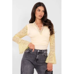 Toto elegantné body je vyrobené z kombinácie polyesteru a elastanu a spája pohodlie s rafinovaným štýlom. Model štandardnej dĺžky s výstrihom do V zvýrazňuje siluetu a dodáva celku jemne ženský charakter. Dlhé rozšírené rukávy s čipkou dodávajú ľahkosť a eleganciu a ozdobné záhyby na látke v prednej časti vytvárajú štýlový detail, ktorý body ozvláštňuje. Vložené vystužené košíčky a praktické zapínanie na háčik a oko zabezpečujú vysokú funkčnosť a uľahčujú obliekanie a vyzliekanie. Dominantný jednofarebný vzor robí z tohto body univerzálny kúsok ideálny na špeciálne príležitosti, ako aj na elegantný každodenný styling.