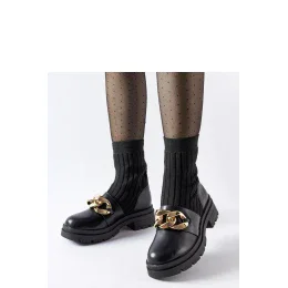 Čierne ponožkové čižmy s retiazkou Giussago sú ideálnou obuvou na každú príležitosť. Sú vyrobené z odolnej gumy, sú odolné voči rôznym poveternostným podmienkam a ich pohodlný dizajn na strednom podpätku zaručuje pohodlie pri nosení. Čierna farba im dodáva eleganciu a dokonale sa hodí k rôznym štýlom. Okrem toho im zdobenie retiazkou dodáva jedinečný charakter, priťahuje pozornosť a robí z nich veľmi štýlový prvok každého outfitu. Tieto čižmy sú nielen praktické, ale aj módne a vďaka atraktívnej cene sú dostupné pre každého bez toho, aby ste museli robiť kompromisy v kvalite a modernom vzhľade. Dodajte svojej zbierke obuvi trochu elegancie a noblesy s týmito čiernymi ponožkovými čižmami s retiazkou Giussago. Ideálne na jeseň a jar.