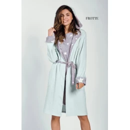Dámsky župan s kapucňou z mäkkého froté úpletu. Pohodlné vrecká na úrovni bokov, zaväzovanie v páse. Manžety a kapucňa lemované jemnými bavlnenými hviezdičkami.