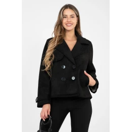 Zamšový přechodný dámský kabát je stylovým návrhem v casualovém provedení, ideálním na každý den. Skvěle se hodí v podzimní, zimní a jarní sezóně jako lehká vrchní vrstva, která podtrhuje charakter každého outfitu. Model s krátkou délkou je vyroben z příjemného na dotek materiálu z polyesteru s přídavkem elastanu. Hladká faktura mu dodává elegantní jednoduchost a jemně elastická tkanina zajišťuje pohodlné nošení a volnost pohybů. Kabát nemá žádnou podšívku ani výplň, díky čemuž se skvěle hodí do přechodných období. Dvouřadé zapínání na knoflíky zdůrazňuje klasický střih, a límec s vykládanými límci dodává celku eleganci. Dlouhý rukáv ozdobený páskem s knoflíkem je decentním, stylovým detail. Praktické kapsy navíc zvyšují funkcionalitu tohoto modelu. Jedná se o univerzální kabát, který snadno sladíte jak s džíny a botami, tak i s elegantnějšími, každodenními sestavami.
