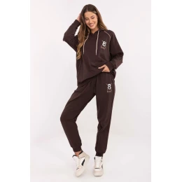 Dámska športová súprava v ležérnom štýle určená na každodenné nosenie. Je vyrobená z bavlny s prídavkom elastanu, čo zaručuje mäkkosť, pohodlie a voľnosť pohybu. Mikina s kapucňou s nastaviteľnými šnúrkami a dlhými rukávmi má na prednej strane vyšívaný motív, zdobený jemnými ševrónmi, ktoré súprave dodávajú elegantný akcent. Nohavice s vysokým pásom a dlhými nohavicami zakončenými manžetami majú praktické bočné vrecká, vďaka čomu sú pohodlné a funkčné zároveň. Ide o súpravu, ktorá spája športové pohodlie s nádychom ženského pôvabu.