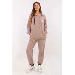 Dámska súprava z džerseja v ležérnom štýle navrhnutá s ohľadom na každodenný štýl. Je vyrobená z bavlny s prídavkom elastanu a zaručuje mäkkosť, pohodlie a voľnosť pohybu. Mikina s kapucňou s nastaviteľnými šnúrkami a dlhými rukávmi má na prednej strane vyšívaný motív zdobený jemnými zirkónmi, ktoré súprave dodávajú elegantný akcent. Nohavice s vysokým pásom a dlhými nohavicami zakončené elastickými manžetami majú praktické bočné vrecká, vďaka ktorým sú pohodlné a funkčné. Ide o súpravu, ktorá spája športové pohodlie so ženským leskom.