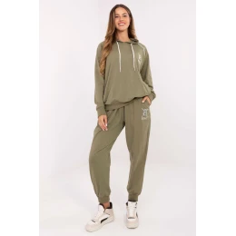 Dámska tepláková súprava v ležérnom štýle, vytvorená s ohľadom na každodenný štýl. Vyšívaná kapucňa s nastaviteľnými šnúrkami a dlhými rukávmi má na prednej strane vyšívaný motív zdobený jemnými zirkónmi, ktorý celku dodáva elegantný akcent. Nohavice s vysokým pásom a dlhými nohavicami ukončené šnúrkami majú praktické bočné vrecká, vďaka ktorým sú pohodlné a funkčné. Je to súprava, ktorá spája športové pohodlie so ženským leskom.