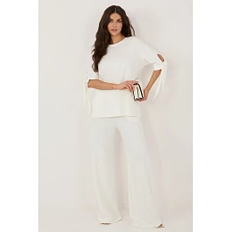 Dámský komplet skládající se z blůzy a kalhot je pohodlnou a stylovou volbou na každý den i do práce. Vyrobený z měkké a příjemné látky s přídavkem viskózy a elastanu poskytuje pohodlí nošení, volnost pohybů a dobře padne k postavě. Blůza má klasický, kulatý výstřih a rukávy délky 3/4 s uzávěrem, co dodává celku jemně ženský charakter. Hladký materiál dělá komplet minimalistický a elegantní, díky čemuž se snadno kombinuje s různými styly. Kalhoty mají dlouhé, široké nohavice a praktické kapsy po stranách, které zvyšují funkčnost modelu. V pase je vsazena elastická guma, co zaručuje pohodlné přizpůsobení bez tlaku. Jedná se o univerzální set ideální jak do každodenních outfitů, tak do práce, spojující pohodlí s moderním, upraveným vzhledem.