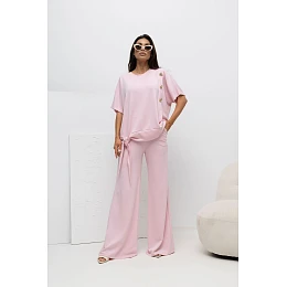 Dámský set skládající se z blůzy a kalhot je ideální volbou pro ženy, které oceňují pohodlí a elegantní, zároveň volný styl. Skvěle se hodí jak na každodenní nošení, tak i do pracovních stylizací, poskytující pohodlí po celý den. Model je vyroben z velmi příjemného materiálu typu "máslo", který díky kombinaci viskózy a elastanu je měkký, jemný a elastický. Tkanina se krásně skládá na postavě, zajišťující pohodlí nošení a volnost pohybů. Blůza s krátkým rukávem a klasickým, kulatým výstřihem se vyznačuje decentními detaily, ozdobnými knoflíčky umístěnými na levé straně a šňůrkou dole vpravo, což dodává celku originální charakter a umožňuje lehké přizpůsobení postavě. Kalhoty s dlouhými, širokými nohavicemi vypadají moderně a elegantně, zároveň poskytují maximální pohodlí. Hladký vzor setu z něj činí mimořádně univerzální a snadno kombinovatelný. Je to skvělá volba pro ženy, které hledají spojení s