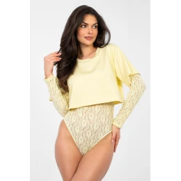 Dvojvrstvové body v ležérnom štýle je spojením pohodlia a ženskej estetiky. Model sa vyznačuje pestrou štruktúrou materiálu, ktorá celému kúsku dodáva moderný charakter. Body je vyrobené z kombinácie polyesteru, viskózy a elastanu, je elastické, mäkké a príjemné na nosenie. Body má štandardnú dĺžku a klasický okrúhly výstrih. Dlhé čipkované rukávy a čipkovaná spodná vrstva dodávajú ľahkosť a jemnú eleganciu, zatiaľ čo vrchná vrstva v podobe košele s krátkym rukávom vytvára efekt štýlového, vrstveného vzhľadu. Model sa zapína na háčiky pre pohodlné nosenie a dobre sedí. Je ideálnou voľbou na každodenný styling k džínsom aj sukniam.