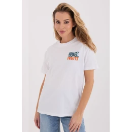 Dámske tričko vyrobené z priedušnej, vysokokvalitnej bavlny, ideálne na každodenné, ležérne oblečenie. Model s pravidelnou dĺžkou a krátkym rukávom poskytuje pohodlie počas celého dňa. Okrúhly výstrih dodáva tričku klasický, univerzálny charakter, vďaka čomu vyzerá skvele samostatne alebo v kombinácii s mikinou či bundou. Na hrudi sa nachádza výrazný nápis, ktorý je dominantným dizajnovým prvkom a zdôrazňuje moderný, mestský štýl. Okrem toho sa na zadnej strane nachádzajú nápisy a potlače, ktoré vytvárajú výraznú grafickú kompozíciu. Ide o skvelú voľbu pre ženy, ktoré si cenia pohodlie a štýlový vzhľad v každej situácii.