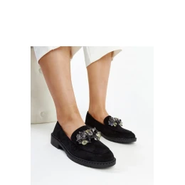 Čierne semišové mokasíny Zemzem sú kombináciou elegancie a pohodlia v jednom. Ich moderný vzhľad s okrúhlou špičkou a navyše umiestnenými kryštálmi ich robí veľmi očarujúcimi. Sú vyrobené z kvalitného semišu a majú pružnú gumovú podrážku, ktorá zaručuje pohodlie pri nosení. Tieto nízke, nazúvacie mokasíny budú skvelou voľbou na každodenné nosenie, ako aj na výnimočné príležitosti. Perfektne sa hodia na nadchádzajúcu jar-leto.