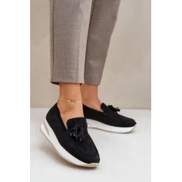 Mokasíny vyrobené z ekologického semišu. Umiestnené na platforme a mäkkom klinčeku poskytujú pohodlie pri nosení a dodávajú ľahkosť postave. Zaoblená špička zaručuje, že topánky sú neuveriteľne pohodlné a mäkká stielka sa postará o pohodlie počas celého dňa. Celkový vzhľad dotvárajú ozdobné strapce, ktoré dodávajú originálny charakter a štýl. Perfektné na každodenný outfit!
