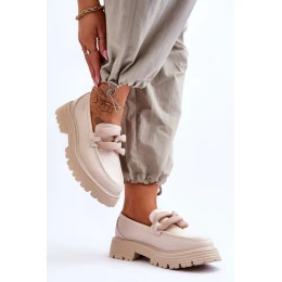 Tieto módne mokasíny boli vyrobené z ekologickej kože. Stoja na platforme a plochom podpätku. Mokasíny majú na prednej strane ozdobnú retiazku. Pohodlné nosenie topánky zabezpečuje stielka z ekokože. Päta týchto topánok je tiež vystužená.