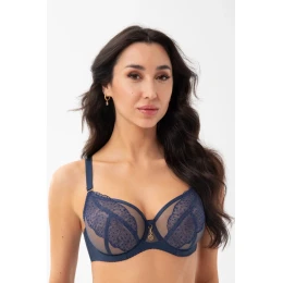 Biustonosz miękki przeznaczony dla kobiet ze średnim i dużym biustem. Zapewnia efekt uniesienia i zebrania biustu do środka, 3-częściowe miski wykonane z haftu na tiulu stabilnym. Górna krawędź miski wykończona taśmą, płynnie przechodzi do ramiączka powodując lepsze podtrzymanie biustu. Na baskince odpinany charms z logo w złotym kolorze. Tył z transparentnej lycry zapewniającej bardzo dobre dopasowanie i podtrzymanie. Fiszbiny boczne zapobiegające zwijaniu się materiału. W zależności od rozmiaru dwu lub trzyrzędowa haftka z trójstopniową regulacją obwodu. Nieodpinane, regulowane ramiączka w trzech szerokościach, w większych rozmiarach dodatkowo wzmocnione welurową taśmą. Metalowe elementy w kolorze jasnego złota (nie zawierają niklu).