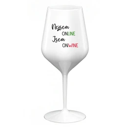 Nerozbitná bílá vinná sklenice s motivem NEJSEM ONLINE JSEM ONWINE je skvělá na zahradu, pláž, výlet, piknik a parádu udělá i při kempování. Jelikož je vyrobená z kvalitního polykarbonátu je de facto nerozbitná. Je to luxusní kousek, s nímž si víno můžete vychutnat prostě kdekoliv. Mají ergonomický tvar, který příjemně padne do ruky a protože je lehká, usnadňuje to její přenášení. Je snadno skladovatelná a lehce se čistí. Díky svému designu si s ní můžete vychutnat doopravdy kdekoliv bezproblémové pití výborného vína.
