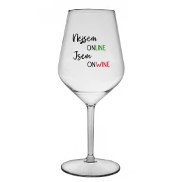 Nerozbitná čirá vinná sklenice s motivem NEJSEM ONLINE JSEM ONWINE je skvělá na zahradu, pláž, výlet, piknik a parádu udělá i při kempování. Jelikož je vyrobená z kvalitního polykarbonátu je de facto nerozbitná. Je to luxusní kousek, s nímž si víno můžete vychutnat prostě kdekoliv. Mají ergonomický tvar, který příjemně padne do ruky a protože je lehká, usnadňuje to její přenášení. Je snadno skladovatelná a lehce se čistí. Díky svému designu si s ní můžete vychutnat doopravdy kdekoliv bezproblémové pití výborného vína.