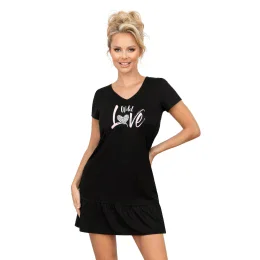 Táto čierna bavlnená nočná košeľa s potlačou Panther má krátke klasické rukávy a výstrih do V, ktorý jej dodáva jemnú ženskosť. Spodnú časť nočnej košele zdobí volánik, ktorý jej dodáva pôvabný a jemný nádych. Ideálna pre ženy, ktoré počas spánku ocenia pohodlie a štýl.