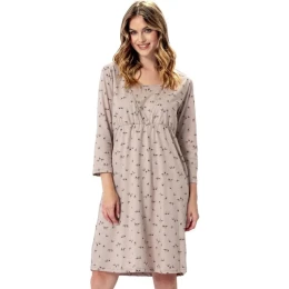 Objavte pohodlie a praktickosť našej nočnej košele, ktorá je ideálna pre dojčiace matky. Košeľa s dĺžkou pod kolená zaisťuje primeranú dĺžku a pohodlie pri nosení. Voľný strih a elastický pás umiestnený pod prsiami zaisťujú pohodlné nosenie, ktoré sa prispôsobí meniacim sa potrebám tela. Nočná košeľa je vyrobená z mäkkého materiálu s potlačou, je príjemná na dotyk a priedušná. 7/8 rukávy sú praktické a elegantné a jemné sfarbenie dodáva jemnú eleganciu. Nočná košeľa zabalená v elegantnom vrecúšku je skvelou voľbou ako darček alebo predmet osobného pohodlia.