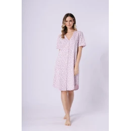 Táto nočná košeľa spája pohodlie s jemným, klasickým štýlom. Voľný, pohodlný strih a mäkká, priedušná tkanina s potlačou zaručujú úplnú voľnosť pohybu a pohodlie pri nosení počas celej noci. Model siaha po kolená, má krátke rukávy a polkruhový lem, čo mu dodáva ľahkosť a ženskosť. Košeľa sa zapína na gombíky po celej dĺžke a jemná farebnosť jej dodáva elegantný, uvoľnený vzhľad. Celkový vzhľad je zabalený v praktickom fóliovom vrecku, ktoré je ideálne aj ako darček.