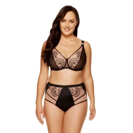Elegantné nohavičky v čierno-béžovej farbe. Nohavičky s vysokým pásom zvýrazňujú a zoštíhľujú pás. Sú vyrobené z hladkého úpletu, sieťoviny a výšivky s kvetinovým vzorom. Široký lesklý elastický pás udržiava nohavičky na mieste. Tyl všitý na zadnej strane opticky zaobľuje zadoček. Pás nohavičiek je vyrobený z bavlny s certifikátom OEKO-TEX, vďaka čomu sú nohavičky pohodlné a bezpečné pre intímnu oblasť. Nohavičky sú navrhnuté a ušité v Poľsku.