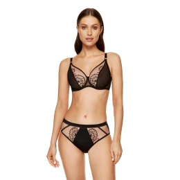 Elegantné nohavičky v čierno-béžovej farbe. Sú vyrobené z hladkého úpletu, sieťoviny a výšivky s kvetinovým vzorom. Na zadnej strane nohavičiek je pútavé tylové zdobenie. Široký lesklý elastický pás udržiava nohavičky na svojom mieste. Pás nohavičiek je vyrobený z bavlny OEKO-TEX?, vďaka ktorej sú nohavičky pohodlné a bezpečné pre intímnu oblasť. Nohavičky sú navrhnuté a ušité v Poľsku.