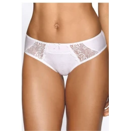 Biele klasické nohavičky Iliana. dokonale priliehajúce k postave. orámované bielym lemovaním. vyrobené z bielej hladkej látky na prednej strane s mašličkou uprostred. spodná časť nohavičiek zdobená jemným kvetinovým stehom. zadná strana zakrytá, hladká. bavlnený klin.