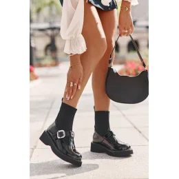 Lakované dámske topánky s nízkym širokým podpätkom a platformou. Zvršok pripomínajúci ponožku, navyše zdobený štýlovým remienkom s prackou, im dodáva moderný charakter. Vnútro je zateplené dekou na obuv len vo výške chodidla. Sú ideálne na mestský štýl, spájajú pohodlie s módnym vzhľadom.