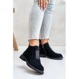 Dámska nízka obuv s dĺžkou nad členok. Vyrobená z prírodného semišu. Osadená na plochom podpätku, ktorý zaručuje stabilitu pri každom kroku. Zaoblená špička. Zapínanie na zips uľahčuje rýchle obúvanie a vyzúvanie topánok. Tento model má elastickú stielku a ozdobu na jazyku.