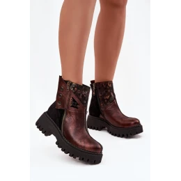 Dámske členkové čižmy Maciejka, vyrobené z kvalitnej prírodnej kože, sú kombináciou štýlu a pohodlia. Osadené na platforme a plochom podpätku poskytujú pohodlie počas nosenia. Model má jedinečný zvršok s nápaditým vzorom, zapínanie na patentku a zips, ktorý im dodáva originálny charakter. Vo vnútri sú podšité kožušinou. Ideálne sú na jesenno-zimnú štylizáciu a spájajú módny dizajn s funkčnosťou.