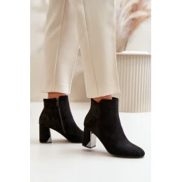 Botki damskie wykonane z eko zamszu. Osadzone na obcasie typu słupek wraz z lustrzanym elementem. Wnętrze ocieplone jest kocem obuwniczym, co zapewni ciepło w chłodniejsze dni. Zapinane na zamek. Noski zaokrąglone. Usztywniony zapiętek zwiększy stabilizację stopy. Przy wyborze rozmiaru prosimy sugerować się tabelą rozmiarów.