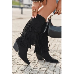 Ocieplane Kozaki Kowbojki Damskie Z Frędzlami Czarne Brivina
