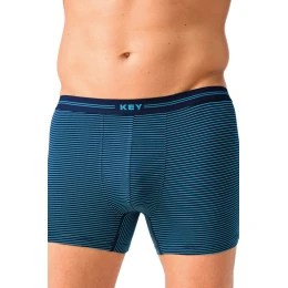 Bokserki męskie KEY w paski to połączenie sportowego designu i naturalnego komfortu. Wykonane z wysokiej jakości dzianiny bambusowej (95% bambus, 5% elastan), są wyjątkowo miękkie, przewiewne i przyjazne dla skóry. Włókno bambusowe charakteryzuje się właściwościami oddychającymi oraz antybakteryjnymi, co pomaga utrzymać uczucie świeżości przez cały dzień. Dodatek elastanu zapewnia elastyczność, idealne dopasowanie do sylwetki oraz trwałość materiału.Fason z krótką nogawką dobrze przylega do ciała, nie roluje się i gwarantuje swobodę ruchów. Szeroka, elastyczna guma z logo KEY stabilnie utrzymuje bieliznę w pasie bez nadmiernego ucisku. Granatowa baza z turkusowymi paskami nadaje modelowi nowoczesny, dynamiczny charakter.To doskonały wybór dla mężczyzn ceniących wygodę, naturalne materiały i stylowy wygląd.