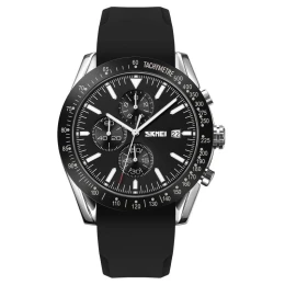 Verzia hodiniek so silikónovým remienkom Skmei 9253 sa prezentuje farebnou schémou inšpirovanou exkluzívnymi prémiovými hodinkami, ktorá im dodáva jedinečný, dynamický nádych. Strieborný obal kontrastuje s hlbokým, ostrým čiernym rámčekom a ciferníkom, čím vytvára luxusný, športový vzhľad, ktorý pripomína štýl špičkových svetových značiek. Silikónový remienok poskytuje dodatočné pohodlie a ľahkosť a dokonale spája eleganciu s funkčnosťou, ktorá sa uplatní v každej situácii.