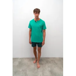 Pánske krátke pyžamo, vrchí diel jednofarebný, pri krku gombíkov, spodný diel farebný s potlačou kaktusov.