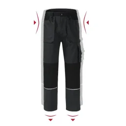 elastická bočná časť bedrového goliera 7 multifunkčných vreciek zdvojený materiál v oblasti kolien a sedadla plastové "D" pútko a karabína na kľúče a identifikačné karty pútko na kladivo dvojité prešitie pre vyššiu odolnosť reflexné prvky