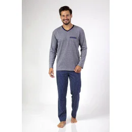 Klasické pánske pyžamo s dlhými rukávmi z kvalitnej bavlny. Hladké tričko s výstrihom do V a náprsným vreckom. Vzorované nohavice s dlhými nohavicami.