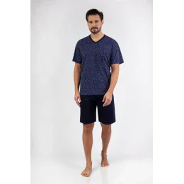 Klasické pánske pyžamo s krátkymi rukávmi z kvalitnej bavlny, so vzorovaným tričkom s výstrihom a jednofarebnými nohavicami s krátkymi nohavicami.