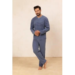 Pánska pyžamová súprava Regina 490 J/25 je klasickou zimnou ponukou vyrobenou výlučne z vysokokvalitnej froté bavlny. Tričko s dlhými rukávmi má výstrih a módny pruhovaný vzor, ktorý súprave dodáva mierne športový, moderný charakter. K súprave sa dodávajú dlhé nohavice jednoduchého strihu - pohodlné a prispôsobené na každodenné nosenie. Mäkký froté úplet poskytuje teplo a pohodlie, takže táto súprava je ideálnou voľbou na chladnejšie večery a zimné noci.