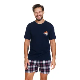 Pánske pyžamo 7201 modré Doctornap - vyrobené z vysokokvalitnej bavlny - tmavomodré tričko s krátkymi rukávmi - zdobené potlačou na prednej strane - kockované šortky s vreckami na bokoch - certifikát OEKO-TEX Standard 100