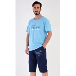 Pánske bavlnené pyžamo Bermudy Lietadlo. Pánske pyžamo sa skladá z trička s krátkym rukávom a nohavíc nad kolená. Jednofarebné tričko zdobí obrázok lietadla. Nohavice majú elastický pás, šnúrku na stiahnutie a praktické vrecká. Použitý materiál je mäkký a príjemný na dotyk. Podiel bavlny na tričku a nohaviciach je 100 %.